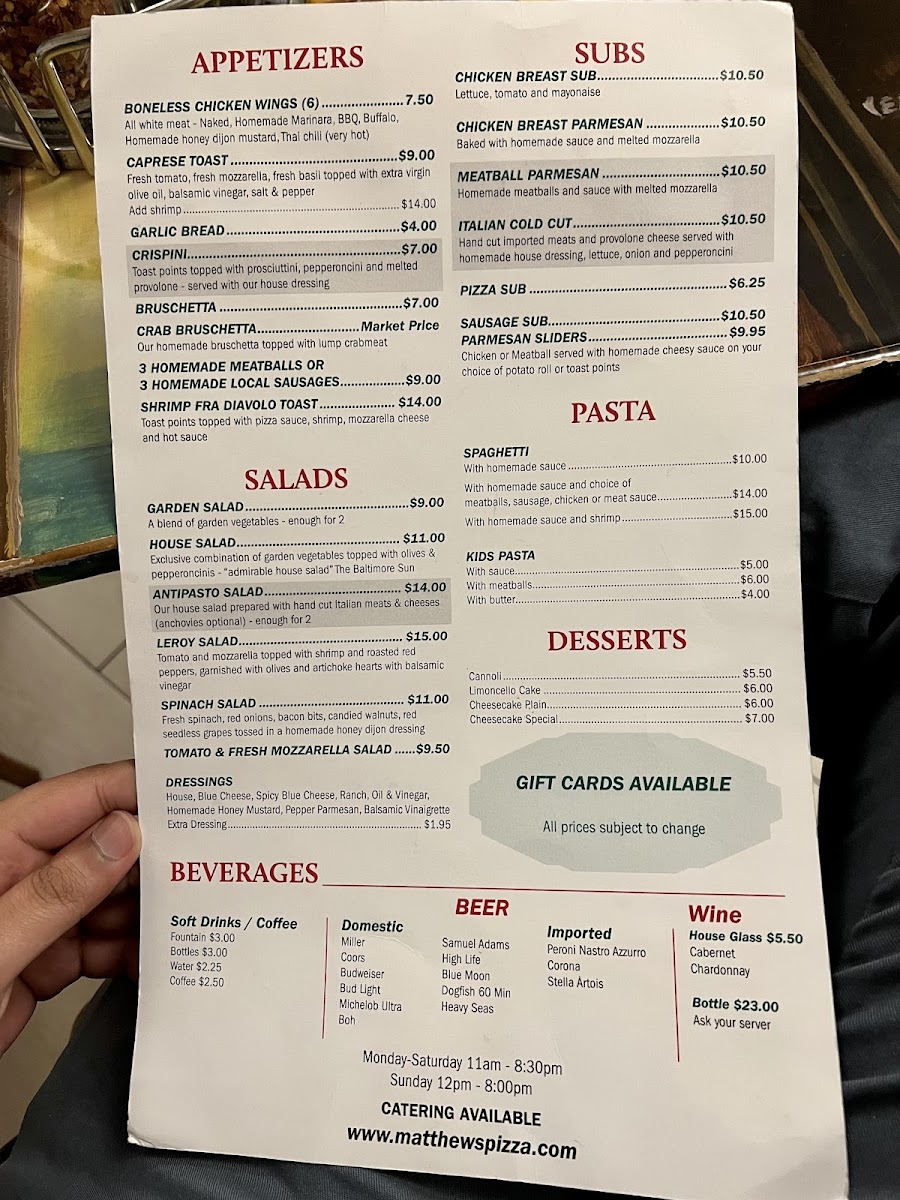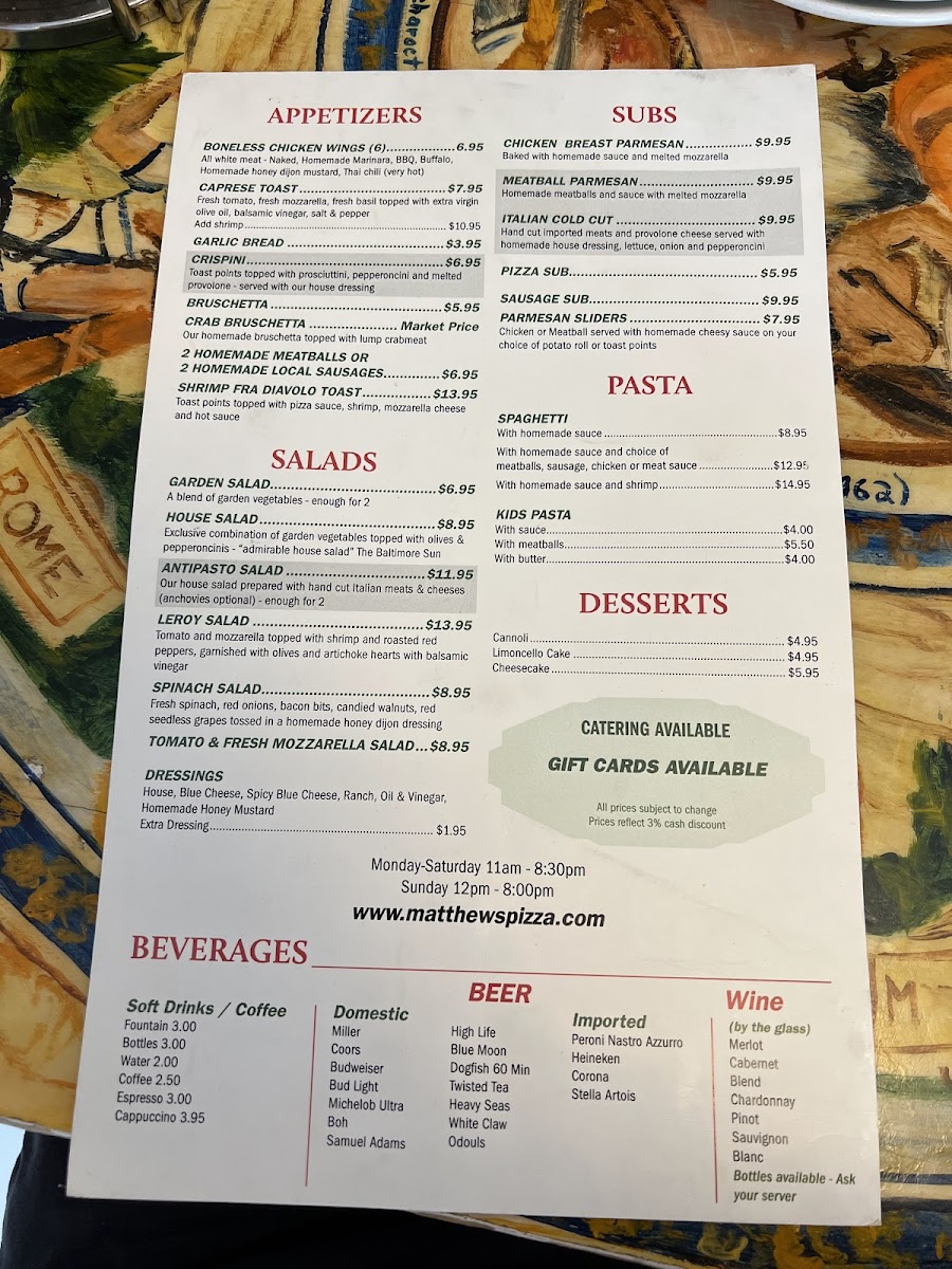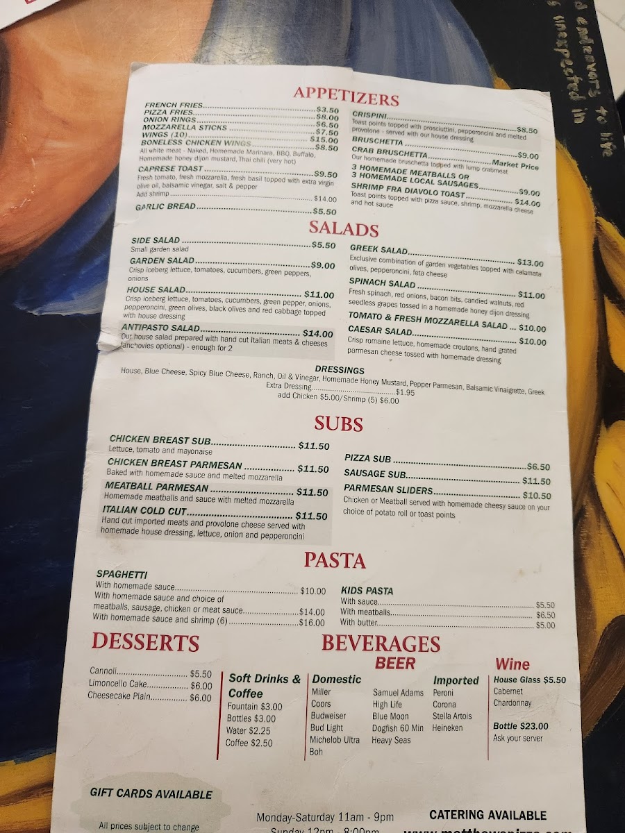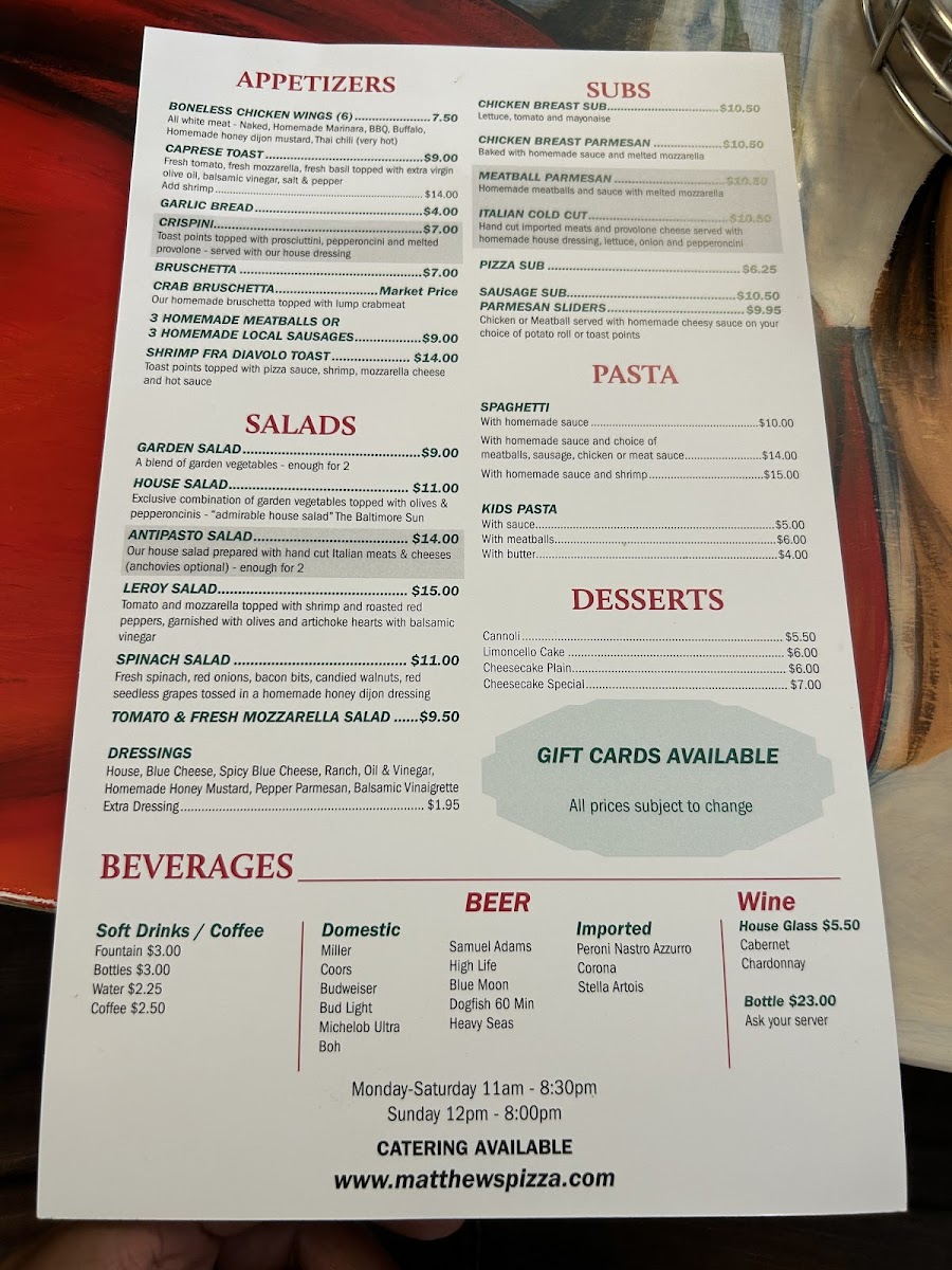 Matthew's Pizzeria Menu