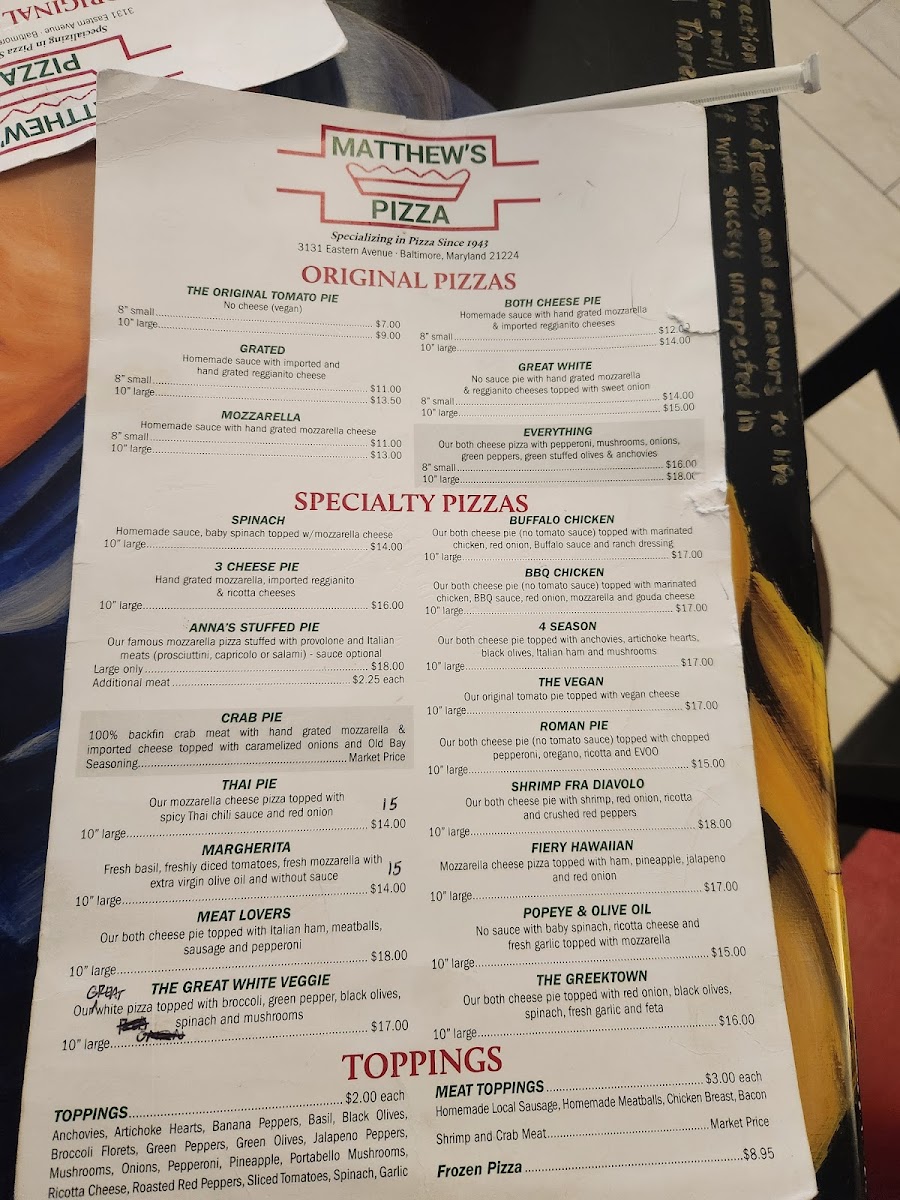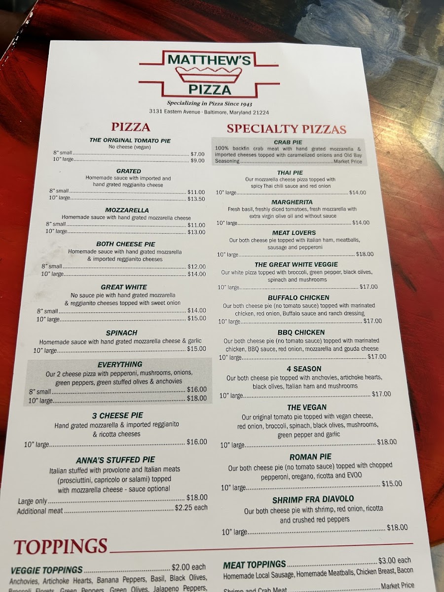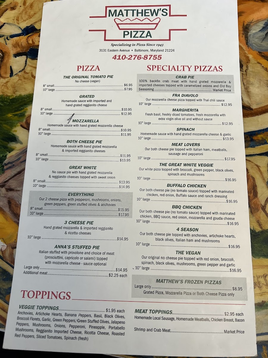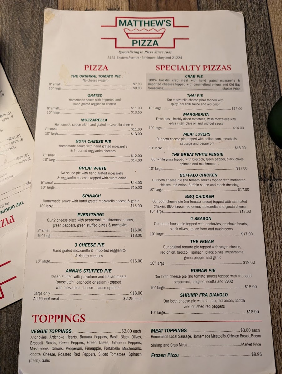 Matthew's Pizzeria Menu