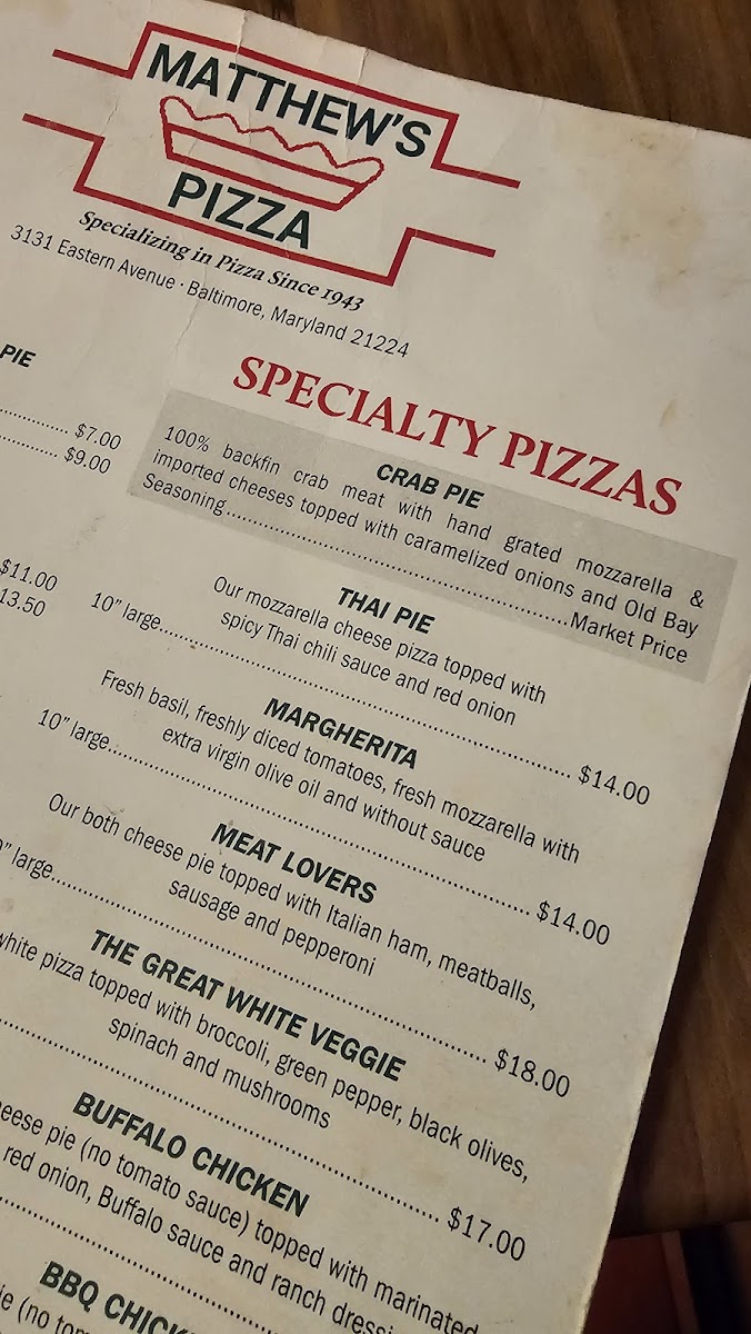 Welcome to Matthew's Pizzeria, a beloved gem nestled in Baltimore, MD. Known for its authentic pizza experience, this establishment offers a well-curated menu that caters to all tastes. Start with an array of delightful subs like the Chicken Breast Parmesan or the flavorful Italian Cold Cut, both priced at just $13. The pasta options are equally enticing, featuring classics like the Spaghetti And Shrimp for $17 or a hearty serving of pasta with your choice of meatballs, sausage, or chicken for $15.